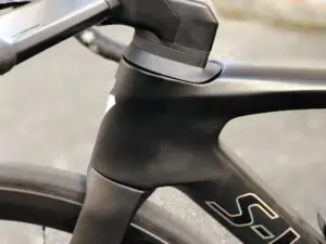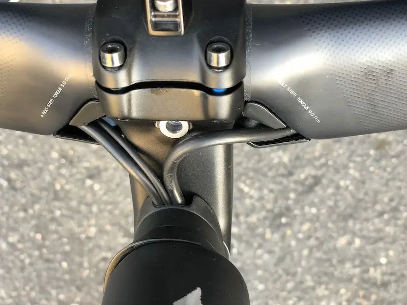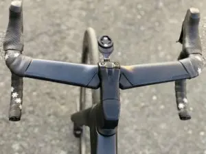 L’ensemble de ces choix techniques va de pair avec le poste de pilotage, qui là aussi permet de gratter environ 6 watts par rapport à un cintre et une potence traditionnels. Durites de freins et fils électriques de dérailleurs cheminent à l’intérieur du cintre au niveau de la partie plate en forme d’aile d’avion, ressortent sous la potence mais restent au contact du cockpit grâce à des bagues spécifiques pour intégrer le pivot de fourche.