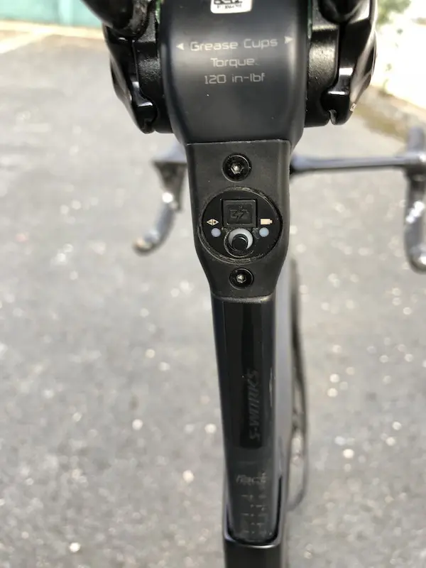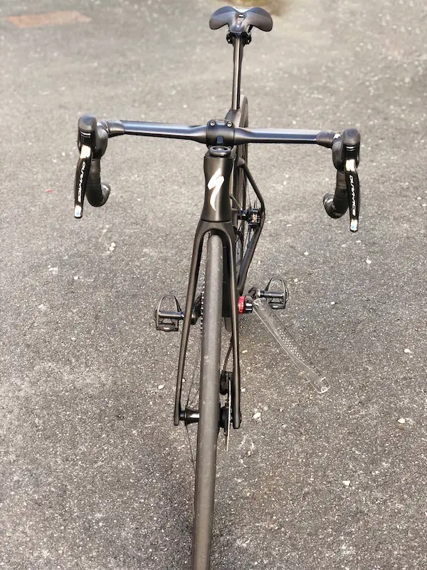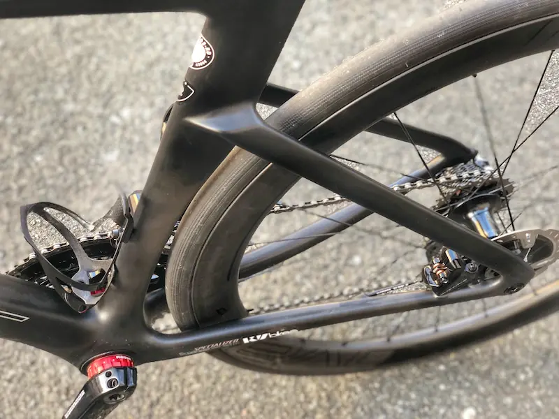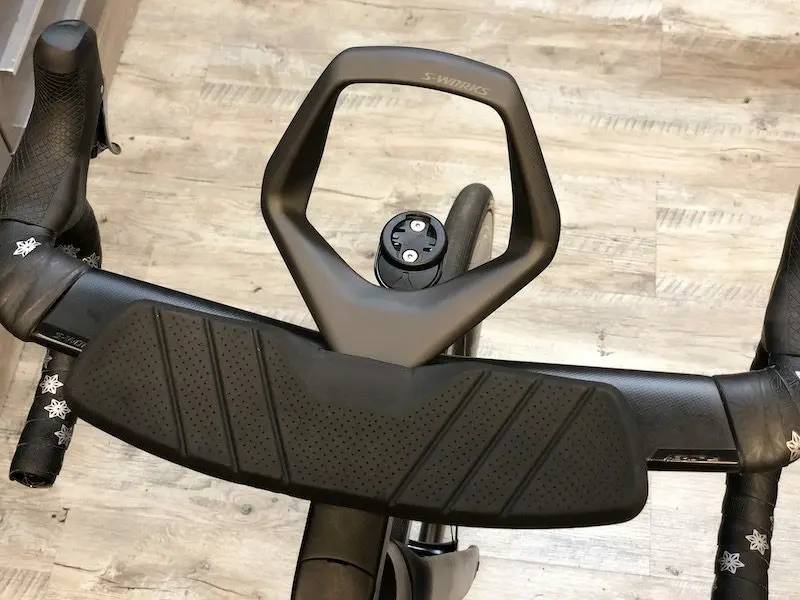Dans son souci du détail, Specialized a mis l’accent sur le tube de selle, avec un crevé pour englober le pneu arrière, une jonction avec les haubans relativement basse et dont la forme est destinée à limiter la traînée de cette partie-là, et enfin sur le placement du boîtier de jonction Di2, bien intégré en arrière de la tige de selle.