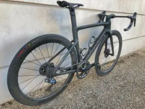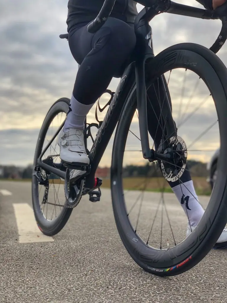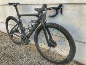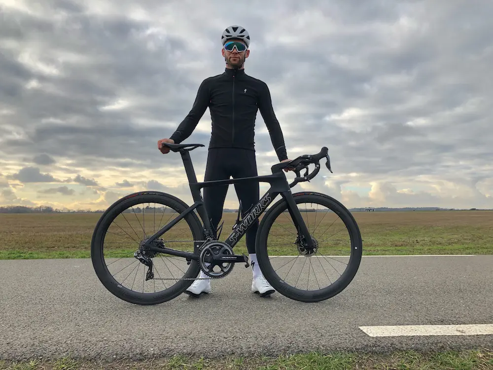 Un compromis qui permet de baisser très légèrement le prix du vélo complet par rapport à la version S-Works (pas de capteur de puissance ici), de gagner une centaine de grammes sur les roues, et aussi un peu de maniabilité vent de côté avec donc des jantes moins hautes.