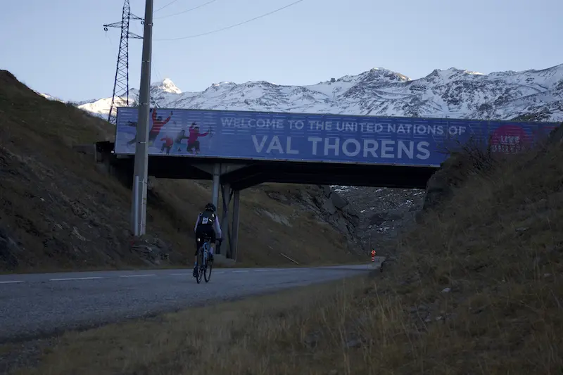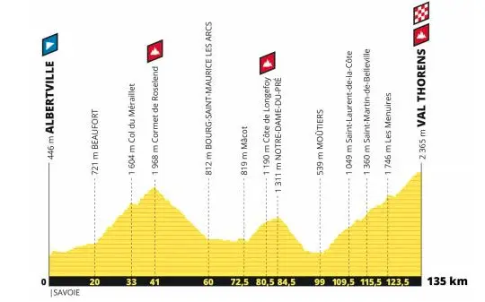 Val Thorens, plus haute station française, s’aborde par une montée de 36 km, 1860 m de dénivelé, un pourcentage moyen de 5,17 % et une pente maximale à 9,1 %. « La montée de Val Thorens : le Tour n’y est plus venu depuis 1994, remarque David Polveroni, mais on monte ici par la petite route de Saint-Laurent, et non la route principale. Cette montée est irrégulière, on alterne de courts passages à 10 % même si la pente reste plutôt aux alentours de 6 / 7. Mais les cartouches utilisées en début d’épreuve feront la différence petit à petit. Après 12 km de montée, une courte descente et on reprend la route principale. 112 km au compteur, 3200 m de dénivelé, un très gros ratio… Il en reste encore 1200.