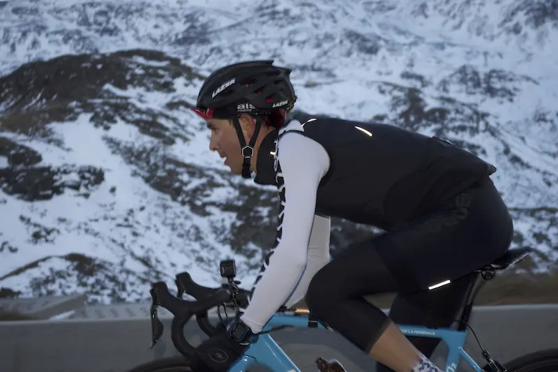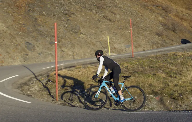 Cette étape nous offre un décor de haute montagne grandiose tout au long du parcours. C’est ici l’un des points les plus remarquables. Tout comme d’un point de vue stratégique, selon moi, car il faudra bien s’économiser jusqu’ici, puisque c’est encore long… très long. Une petite descente permet de reprendre de la vitesse. C’est court mais ça fait du bien, et c’est reparti pour les 5 derniers kilomètres jusqu’au col. Encore une fois, on évolue ici dans un cadre magnifique. Le pourcentage de ces 5 derniers kilomètres n’est toujours pas excessif mais régulier à 6 /8 % mais les kilomètres de montée s’accumulent et on approche des 2000 m (sommet à 1968 m). »