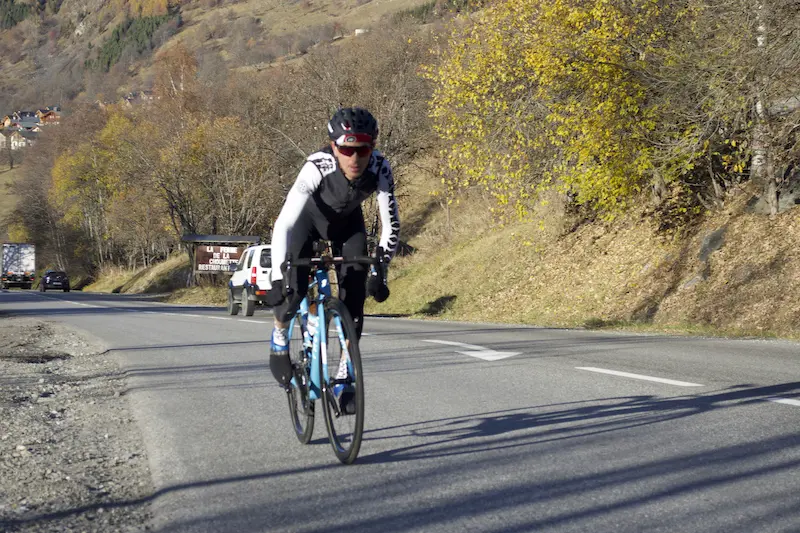 Je pense que cette portion de faux plat est le bon endroit pour se ravitailler. En effet passé, le col du Tra (l’autre appellation de cette montée) et le village de Notre-Dame-du-Pré, on aborde une descente très technique. Une succession de virages en épingle (une petite trentaine en 10 bornes), le tout sur une chaussée en mauvais état au moment de la reconnaissance. Le décor est planté. Pas trop le temps à ce moment-là pour mettre la main à la poche. Par contre il faut rester vigilant. Ce n’est pas une descente où l’on prend de la vitesse. Les courbes s’enchainent. On arrive à Saint-Marcel, avec une très courte montée de 700 m mais qui fait bien mal aux jambes, pour nous permettre de reprendre la grande nationale jusque Moutiers. Nouvelle rare portion de répit avant l’ogre du jour.«