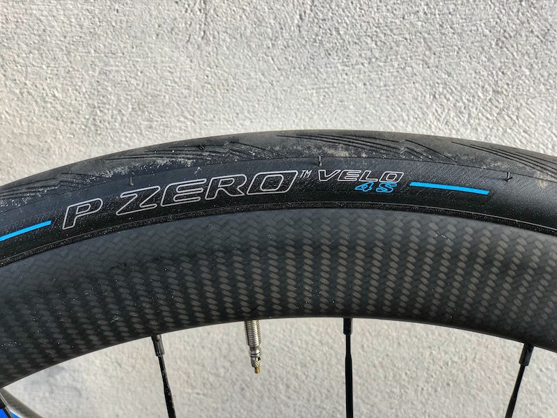Pour contrecarrer la puissance supérieure du freinage, surtout avec des disques de 160 mm ici, Pinarello mise sur la qualité des gommes plutôt que sur leur section. Notons toutefois qu’avec des jantes larges de 27 mm, les pneus de 25 mesurent en réalité 28 mm. Et c’est plutôt bien vu avec des pneus Pirelli PZero 4S, à l’excellente tenue de route même et surtout sous l’humidité.