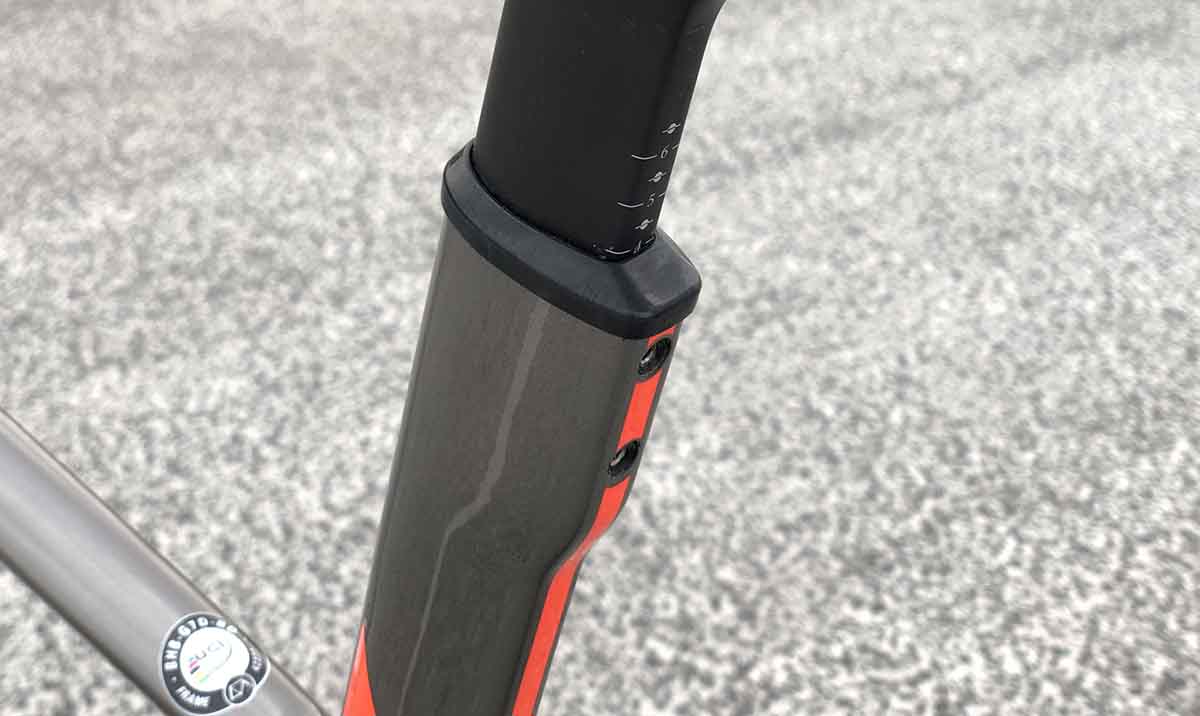 Le serrage de la tige de selle est simple et facilement accessible par deux vis situées sur l’arrière du tube de selle. La finition est soignée avec la présence d’un petit cache en silicone amovible sur le haut. À noter que la tige de selle abrite la batterie Di2, dans laquelle elle vient ingénieusement se clipser.