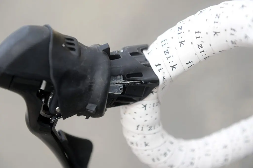 À l’avant, le parallélogramme a été réduit. Fini le grand bras de levier, le cheminement du câble a légèrement changé mais la précision du changement de plateau est toujours aussi bonne. Moins encombrant, le dérailleur avant permet surtout l’emploi, sans difficultés de pneumatiques de grosse section à l’arrière (plus de 28 mm). Le positionnement avec la vis pointeau (qui vient se poser sur le tube se selle par l’intermédiaire d’une plaquette de protection) est lui toujours d’actualité.