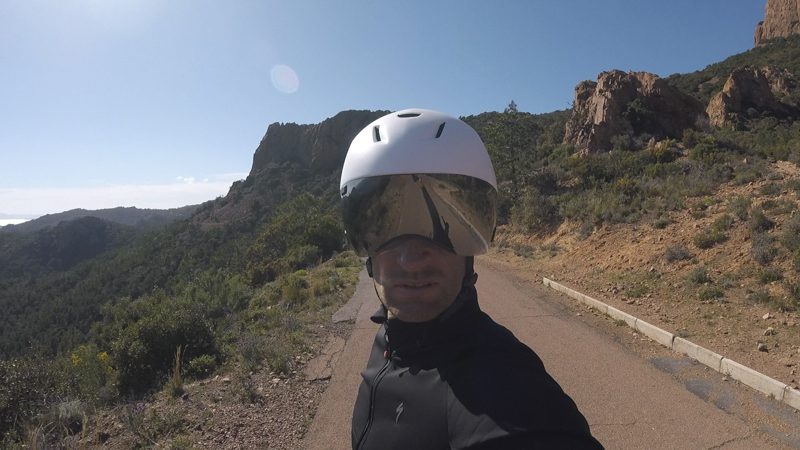 Est-ce que les trois aérations frontales suffisent à rafraîchir l’intérieur du casque et évacuer l’air chaud par l’arrière ? Sur ce point, difficile de nous prononcer. Testé de février à avril sur la Côte d’Azur, les conditions météorologiques n’ont pas offert de grosses chaleurs pour véritablement sentir l’efficacité de la ventilation du Codatronca. Sous des températures de 22-23° et une sortie longue de 170 km, nous n’avons pas été gêné par une sensation de chaleur et par l’apparition de buée même lors d’un effort d’intensité moyenne dans une ascension de 18 km. La mousse située sur la largeur du front devient elle rapidement humide en absorbant la transpiration, mais cette zone n’est pas excessivement chaude. Mais sur cette longue sortie, des gouttes sont apparues et ont commencé à couler. Avec le design du Codatronca et son écran panoramique, difficile alors d’aller les essuyer pour éviter qu’elles ne finissent leur course salée dans vos yeux.