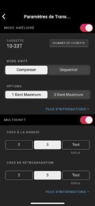 La grosse nouveauté, c’est qu’il est désormais possible de personnaliser l’action des leviers, avec non seulement la possibilité d’intervertir les ordres donnés par les manettes gauche et droite, mais aussi le fonctionnement des changements de vitesse quand on laisse le doigt appuyé sur un palet, avec le balayage de toute la cassette, ou un changement limité à deux ou trois dents par exemple.
