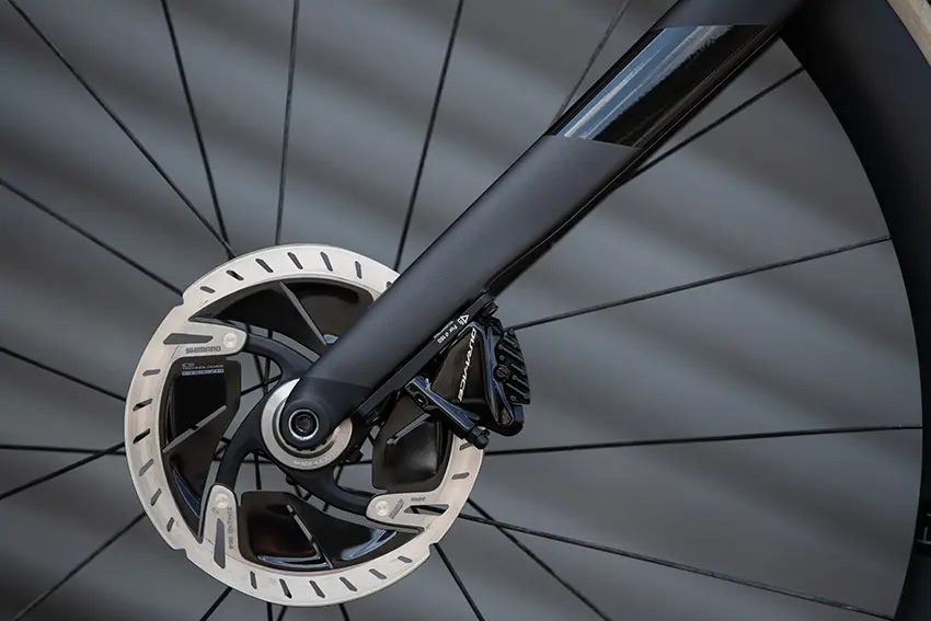 Si Cannondale tient à conserver la possibilité de l’option d’un freinage sur jante à patins en proposant deux modèles dotés de cette technologie, la nouvelle gamme SuperSix Evo fait tout de même la part belle au freinage à disque. Compatible avec la plupart des standards de roues axe traversant, la version à disque du cadre est conçue pour accepter les axes traversants Speed Release, pour favoriser les actions de maintenance et la rapidité des dépannages.