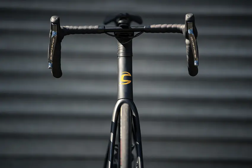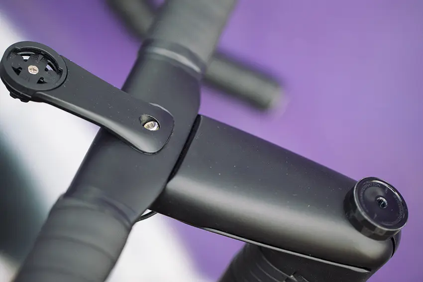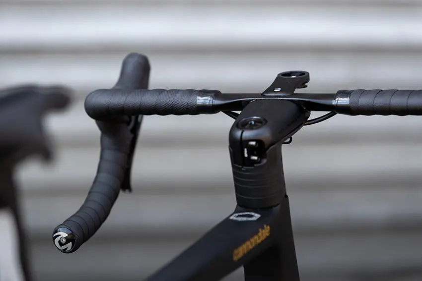 Proposé aussi en version avec cintre et potence classique, le SuperSix Evo présente sa configuration la plus poussée quand il est habillé du combo Cannondale HollowGram Save SystemBar. Un poste de pilotage au profil affiné et lissé, constitué de deux pièces interchangeables et d’une liberté d’ajustement de 8°. A noter que le support de compteur intégré nous apparaît par contre un poil haut, plus à l’encontre de cet esprit « aéro ». On aimerait la possibilité d’une attache par le dessous pour favoriser son prolongement du cintre…