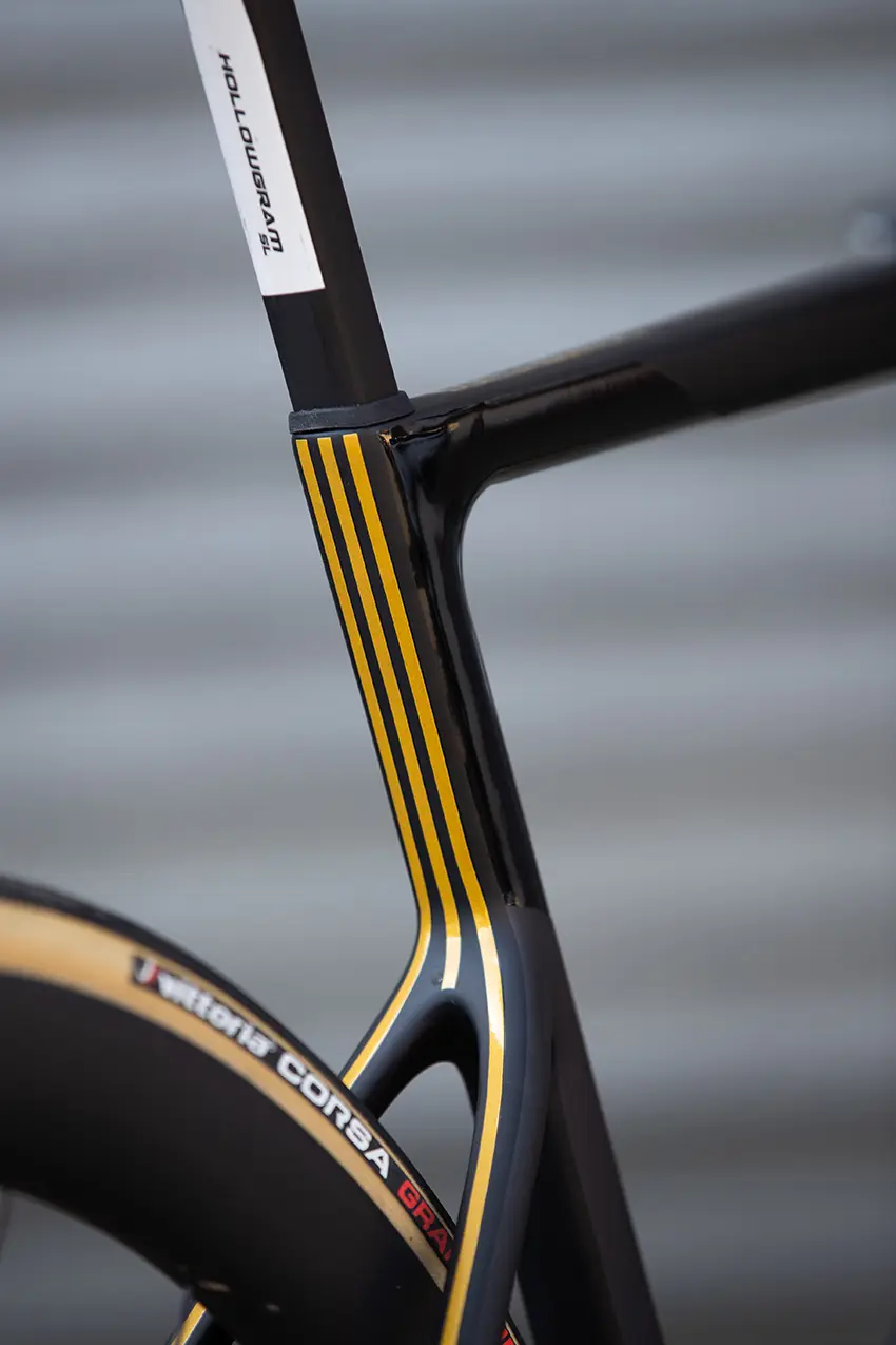 C’est donc au siège de ses bureaux Europe, à Fribourg-en-Brisgau, que Cannondale a convié la presse internationale le temps d’une journée et d’un essai, sur une boucle vallonnée de 70 kilomètres dans les collines environnantes. L’occasion pour nous d’en découvrir un peu plus sur ce nouveau SuperSix Evo et les caractéristiques qu’il renferme. Privilège de coutume, notre version d’essai est bien évidemment la plus poussée de la nouvelle gamme Cannondale du SuperSix Evo. Celle montée en Shimano Dura Ace Di2 avec roues HollowGram 45 KNOT (pneus Vittoria Corsa 25mm) et cockpit HollowGram Save SystemBar.