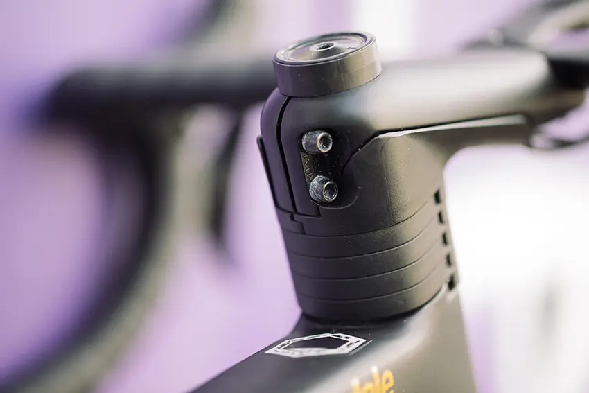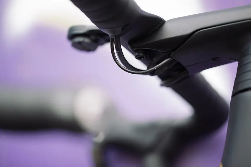 L’intégration de la câblerie suit également cet esprit. La douille de direction comporte un passage interne pour l’acheminement des gaines de freins. Dans le but de réduire les perturbations, de limiter les parasites et d’épurer le style de la machine. Une série de bagues est associée pour habiller l’ensemble et offre un accès facile pour l’entretien.