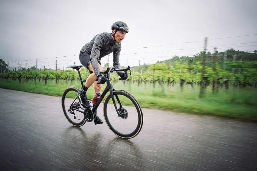 Située entre les catégories « Elite Race » propre au très exclusif SystemSix et « Endurance » du Synapse, le SystemSix Evo apparaît comme une machine ultra-polyvalente, adaptée à de multiples terrains. Il est toujours difficile d’apprécier à la sensation le travail fait sur l’aérodynamisme, mais on constate que la réalisation n’est pas que visuellement réussie dans la mesure où ce SuperSix Evo dégage une forme de fluidité à enrouler dans la plaine, sans parasite sur le front et au niveau des tubes. Le centre de Fribourg traversé à faible allure, les bouches d’égouts et les jonctions de pistes cyclables permettent de rassurer d’entrée sur un autre point apprécié de la version précédente : le confort, qui semble excellent ici ! À la relance et au sprint, le vélo affiche une rigidité et un niveau de performance impeccable, sans être trop exigeant pour un organisme moins solide. Agile, habile et facile à manier, le vélo dégage une réactivité très jouissive. Dans son tableau comparatif, en taille 56, Cannondale avance 1 417 g pour l’ensemble cadre/fourche/tige selle de la version à disque. À l’utilisation, on le sent léger effectivement. Les roues HollowGram 45 KNOT se montrent bien polyvalentes. On apprécie la rigidité et l’aérodynamisme en plaine, et un profil de 45 mm qui leur permet de s’exprimer aussi bien sur des terrains plus accidentés. Le premier essai est très concluant (malgré une météo très humide qui nous a permis de mesurer aussi une fois de plus l’excellent comportement des pneus Vittoria Corsa sous la pluie). Rigide, réactif, léger, confortable… Une somme d’arguments qui en fait pour nous un de ces vélos au comportement polyvalent quasi parfait, quelque soit la région de pratique et le profil de l’utilisateur (à condition bien entendu d’avoir le budget !).