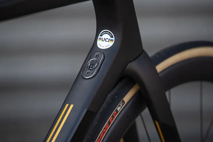 Comme c’est souvent le cas, le boitier de jonction Di2 vient se loger dans le tube diagonal du SuperSix Evo. C’est élégant et fin. D’une manière général, le soin apporté dans les détails et les finitions sont remarquables.
