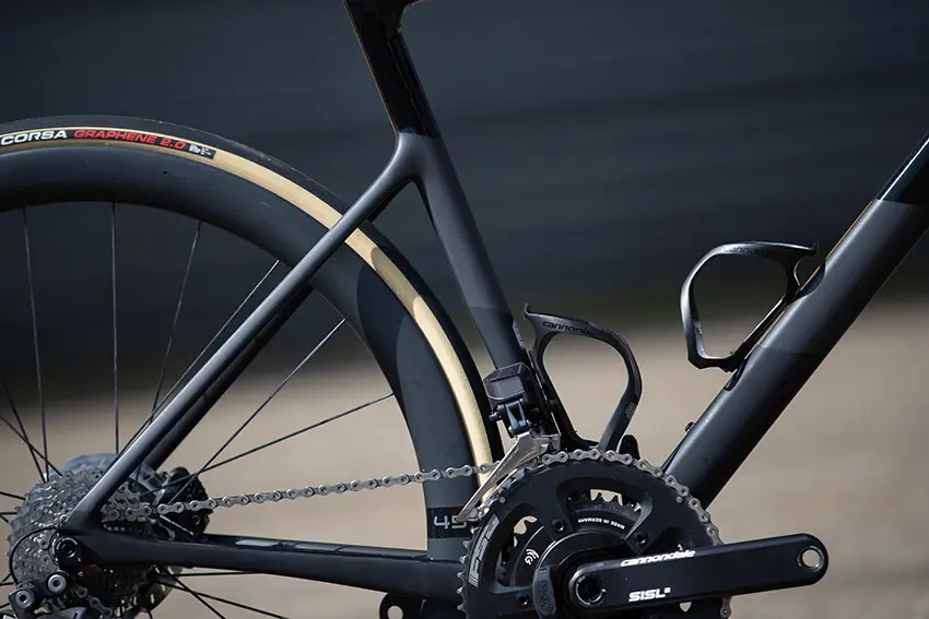 Dans sa version à disque, le cadre a été conçu avec un dégagement prévu pour accueillir des pneus de 30 mm et offrir une certaine polyvalence au vélo, pour accroître le confort avec un accès à des sections plus grosses dans le choix de ses pneumatiques, lorsqu’on peut être amené à pratiquer sur des routes plus chaotiques. Cannondale pense ses vélos comme « un système » dans lequel chaque élément doit œuvrer de manière homogène l’un avec l’autre. De cette réflexion, les vélos sont montés avec les nouvelles roues HollowGram 45mm KNOT, de manière à offrir une roue au profil polyvalent.