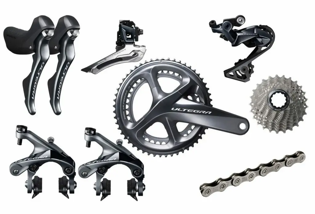 Poids (g) Prix (€) Groupe complet 2779 1531 Leviers combinés +freins + disques 1144 998 Dérailleur avant 106 54 Dérailleur arrière 200 89 Pédalier 750 259 Freins Avec les leviers Cassette 232 89 Chaine 257 42 Câbles et gaines dérailleurs 90