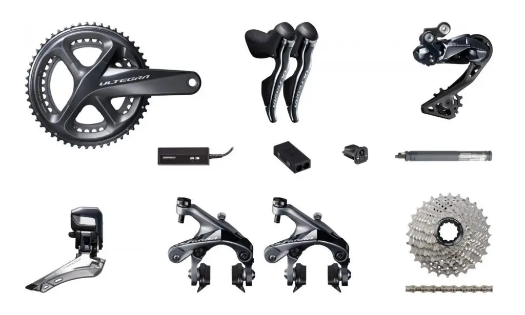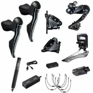 Poids (g) Prix (€) Groupe complet 2498 3783 Leviers combinés + freins + disques 992 1418 Dérailleur avant 104 449 Dérailleur arrière 204 689 Pédalier 675 549 Freins Avec leviers Cassette 175 269 Chaine 243 61 Interface + batterie 105 189 + 159