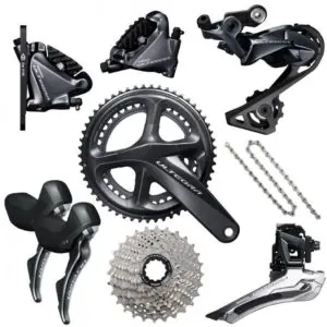 Poids (g) Prix (€) Groupe complet 2503 2515 Leviers combinés + freins + disques 1093 1278 Dérailleur avant 69 129 Dérailleur arrière 158 229 Pédalier 675 549 Freins Avec les leviers Cassette 175 269 Chaine 243 61 Câbles et gaines dérailleurs 90