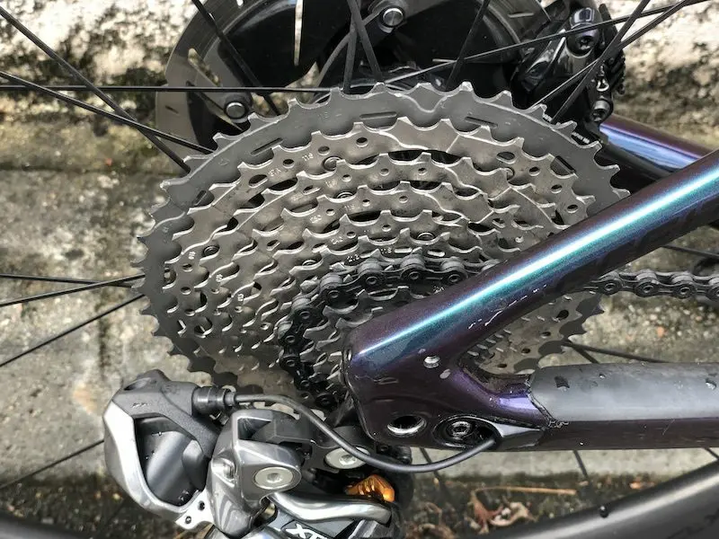 En dehors d’un surpoids d’un peu plus de 4 kg (moteur + batterie) par rapport à un vélo typé endurance avec un niveau d’équipement équivalent, le S-Works Turbo Creo SL pourrait aussi largement entrer dans cette catégorie de machines. Il ne dispose certes que de 11 vitesses, car les caractéristiques du moteur imposent un seul plateau à l’avant, mais elles sont compensées par une cassette à l’arrière avec une large plage de développements. Pour gérer les pignons de 11 à 42 dents, un dérailleur XTR Di2 de VTT est nécessaire.
