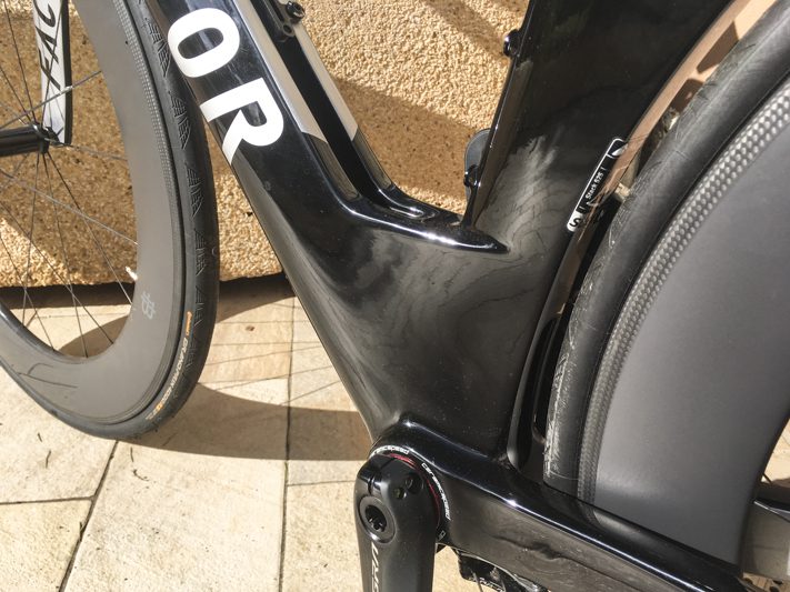 Effectivement, l’étrier arrière placé sous les bases, à côté du boîtier de pédalier, est un vrai point faible. À cet endroit, la puissance de la roue est bien trop importante pour obtenir un freinage digne de ce nom, notamment en cas d’urgence pour par exemple corriger une erreur de trajectoire dans une descente. Disons qu’on ne freine pas, mais plutôt que l’on ralentit. L’intérêt de cette position est ici de privilégier l’aérodynamisme, d’autant plus sur un vélo sur lequel tout est fait pour prendre de la vitesse.