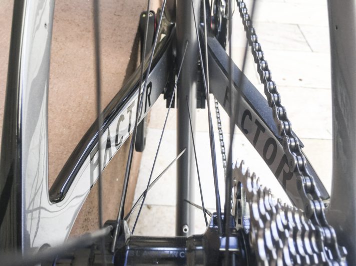 Que vous ayez l’habitude de rouler en position aérodynamique ou pas, le Factor Slick est un vélo assez facile d’accès. Evidemment, passés les premiers kilomètres durant lesquels les néophytes perdront leurs repères de position habituelle, le Slick s’adopte rapidement. Malgré sa grande rigidité, notamment dans la direction du fait de cette énorme section de raccord, qui peut surprendre sur des relances, l’une de ses premières qualités est étonnamment le confort, d’autant plus si votre position est bonne et qu’elle ne vous cause pas de désagrément musculaire. En effet, ce cadre filtre bien les vibrations, tant au niveau de la fourche et du cockpit que du tube de selle, ce qui laisse votre arrière train profiter pleinement des kilomètres qui défilent. Ce confort, c’est aussi une conséquence de ce double tube diagonal : les sections de ces deux tubes sont plus fines que s’il ne s’agissait que d’un seul gros tube de carbone. Qui dit plus de finesse dit plus d’absorption des vibrations, donc plus de confort, car il n’y a ici pas d’empilement de couches de carbone pour compenser une faible section du tube.