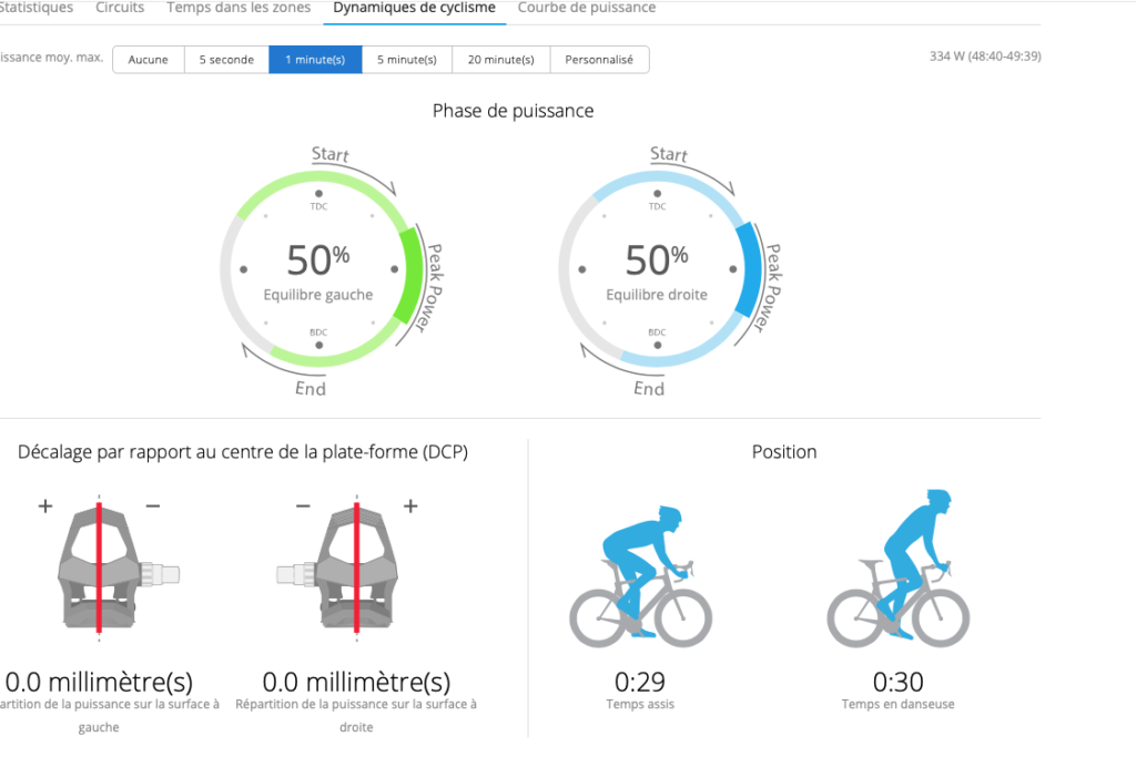 Une donnée plus interessante est celle du temps passé assis ou en danseuse. Durant un intervalle donné ou bien sur toute la sortie, on a cette information de disponible ainsi que la puissance moyenne sur cette phase. Me concernant, cela me permet de voir (bon, je m’en doute depuis très longtemps) que je produis plus de watts en danseuse qu’assis.
