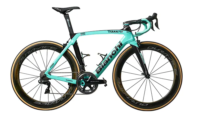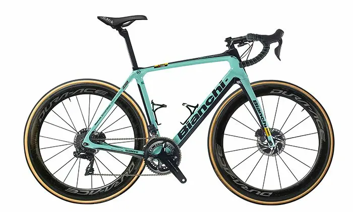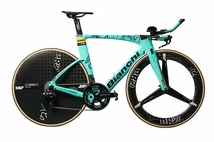 Les vélos Bianchi de l’équipe Jumbo-Visma seront montés avec une transmission Shimano Dura-Ace Di2 (freinage à disque hydraulique ou à étriers à patins), des roues Shimano Dura-Ace C40 ou C60 (et PRO pour les chronos), de pédales Shimano Dura-Ace et de boyaux Vittoria Corsa. Fi’zi:k demeure le partenaire technique pour l’assise et FSA-Vision pour la partie cintre-potence.