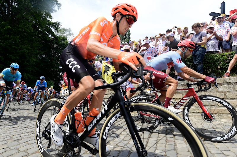 Chez CCC Team avec Giant, on navigue encore entre le modèle TCR avec freins à patins et le Propel Advanced SL aérodynamique et tout intégré avec des freins à disque. Notons que le TCR à patins permet des montages très légers, bien en dessous de la limite actuelle de l’UCI à 6,8 kg, et qu’il est nécessaire de placer des poids supplémentaires dans ce montage pour atteindre le poids légal.