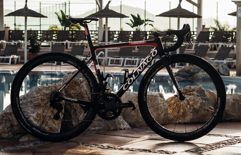 Le Team UAE reste pour l’instant fidèle au freinage à patins, même si ce Colnago V3RS est la toute dernière version du constructeur transalpin. Le reste de l’équipement est à l’avenant, avec uniquement des marques italiennes (groupe, roues, périphériques), sauf pour les pédales qui sont des Look Keo.