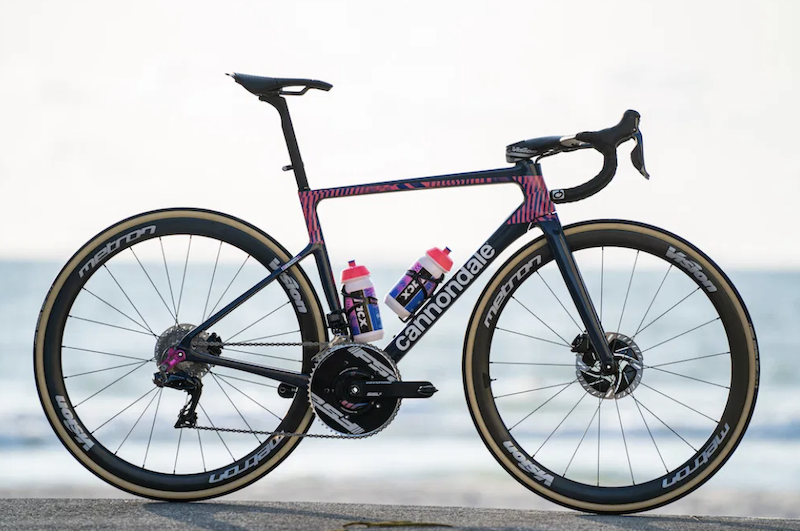 L’équipe EF Pro Cycling poursuit avec Cannondale, en utilisant deux modèles alternativement, selon les préférences des coureurs et le terrain, et là aussi désormais uniquement avec des freins à disque : les System Six et Super Six. Transmissions Shimano, roues et périphériques Vision composent ces vélos, par ailleurs les seuls à utiliser les pédales Speedplay.