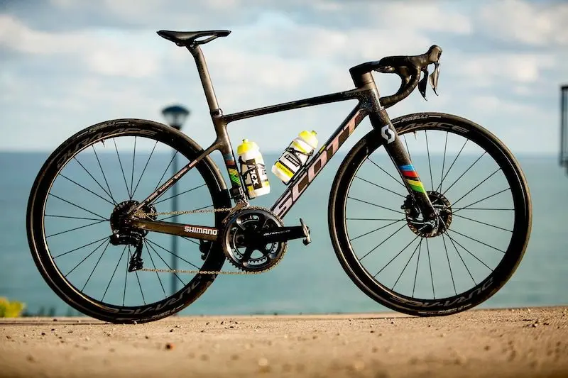 Comme ici avec le vélo d’Annemiek van Vleuten, la championne du monde, hommes et femmes des équipes Mitchelton – Scott rouleront avec les mêmes vélos : soit des Foil Disc pour les parcours roulants, soit des nouveaux Addict RC là où la polyvalence est nécessaire. Cet Addict devrait approcher les 7 kg malgré le freinage à disque et se révéler parmi les plus légers du peloton.