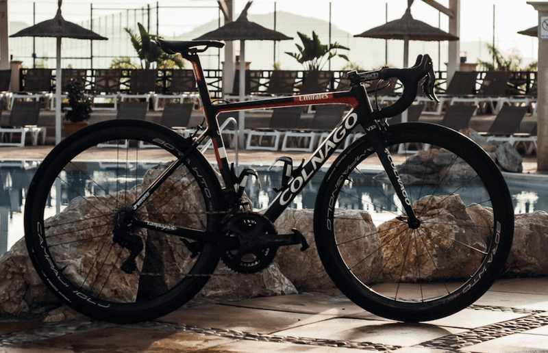 Le Team UAE reste pour l’instant fidèle au freinage à patins, même si ce Colnago V3RS est la toute dernière version du constructeur transalpin. Le reste de l’équipement est à l’avenant, avec uniquement des marques italiennes (groupe, roues, périphériques), sauf pour les pédales qui sont des Look Keo.
