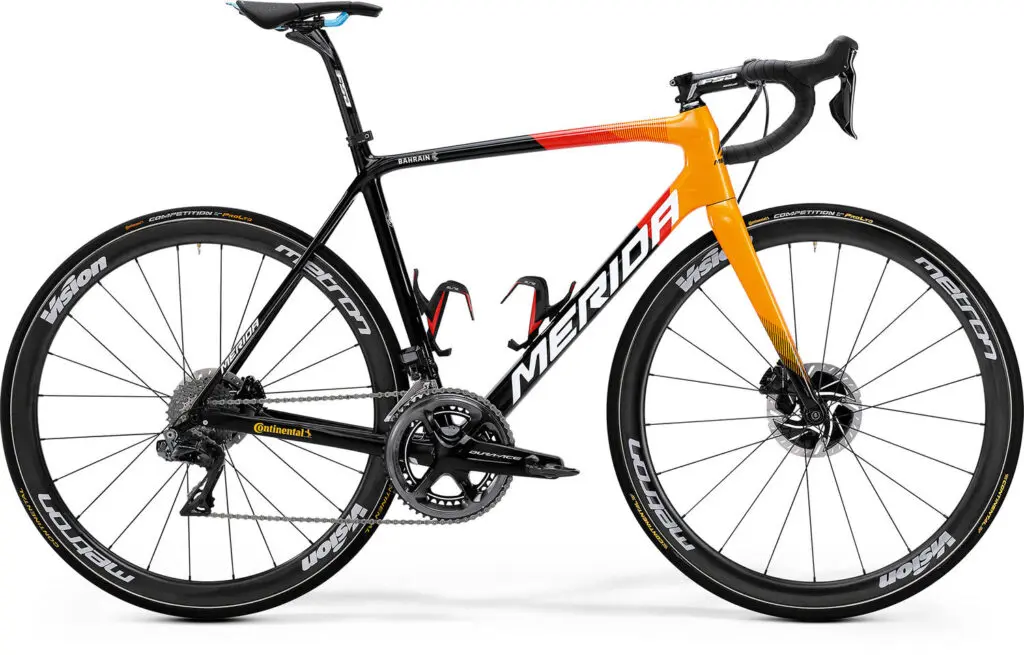 | Cadres et fourches : Merida Reacto Disc, Scultura Disc, Time Wrap Roues : Vision Groupes : Shimano Dura-Ace Di2 Disc Pneumatiques : Continental Selles : Prologo Postes de pilotage : FSA/Vision Pédales : Shimano Dura-Ace Compteurs : Garmin Capteurs de puissance : Shimano Porte-bidons : Elite Contact : bahraincyclingteam.com, merida-bikes.com |