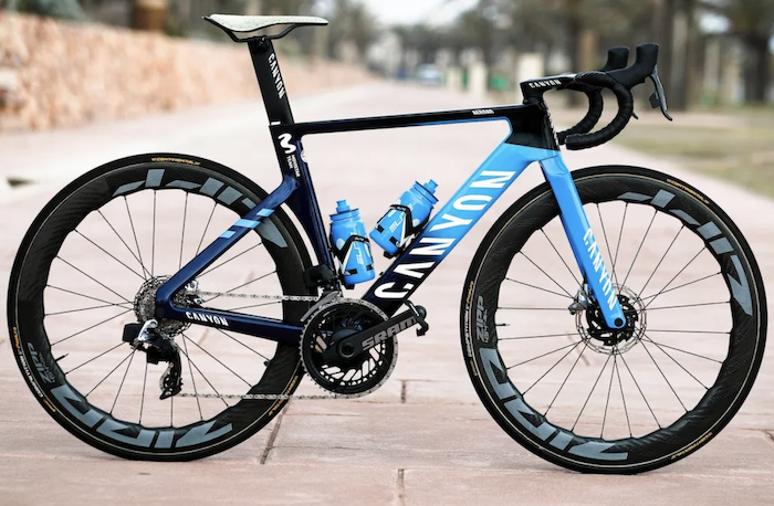 L’équipe Movistar comptera encore en 2021 sur le vétéran Alejandro Valverde (sans doute pour sa dernière saison) et sur les vélos Canyon, avec le nouvel Aeroad CFR pour les parcours mixtes et l’Ultimate CFR pour la montagne. Les groupes Sram Red eTap AXS seront montés avec des combinaisons de plateaux non proposées dans le commerce de 54-41 et 52-39, avec une cassette 12 vitesses et un départ à 10 dents. Ce choix vient principalement du fait que les coureurs (les sprinters notamment) n’aiment pas trop utiliser le pignon de 10, qui procure un très gros écart de développement avec le 11. Pour le reste, les coureurs utiliseront toute la gamme de roues Zipp (303, 404, 454…) en boyau ou en tubeless.