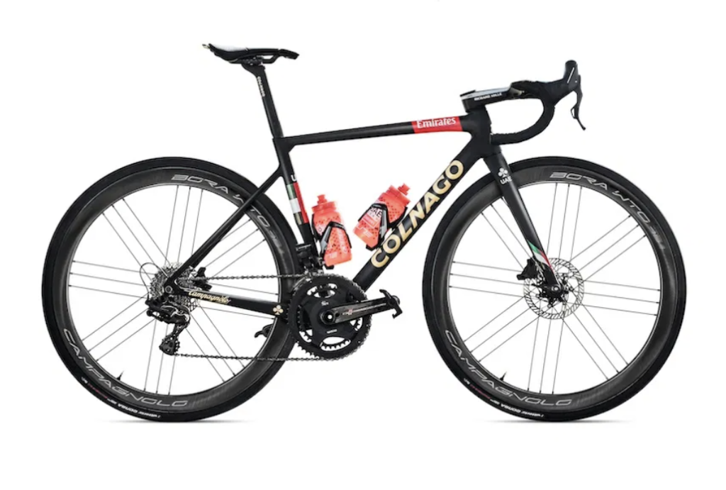 | Cadres et fourches : Colnago V3RS Disc et Kone Roues : Campagnolo Groupes : Campagnolo Super Record EPS Disc Pneumatiques : Vittoria Selles : Prologo Postes de pilotage : Deda Elementi Pédales : Look Keo Blade Carbon Ceramic Ti Compteurs : SRM Capteurs de puissance : SRM Porte-bidons : Elite Contact : uaeteamemirates.com, colnago.com |