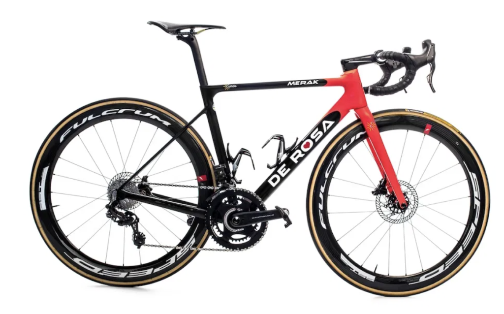 | Cadres et fourches : De Rosa Merak, SK Pininfarina et TT03 Roues : Fulcrum Groupes : Campagnolo Super Record EPS Disc Pneumatiques : Michelin Selles : Selle Italia Postes de pilotage : FSA/Vision Pédales : Look Keo Blade Carbon Ceramic Ti Compteurs : Wahoo Capteurs de puissance : SRM Porte-bidons : Elite Contact : equipecofidis.com, derosa.it |