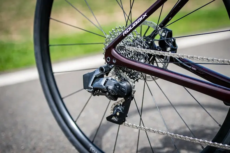 Les deux cassettes sont disponibles en 10-30 (pignons de 10, 11, 12, 13, 14, 15, 16, 17, 19, 21, 24, 27, 30 dents) et en 10-36 (pignons de 10, 11, 12, 13, 15, 17, 19, 21, 24 ,28, 32, 36 dents, comme sur notre vélo d’essai), et le dérailleur arrière dispose d’une capacité maximale de 36 dents, même s’il est aussi compatible avec une cassette Red ou Force de 10-28. Des braquets très réduits qui permettent d’envisager des parcours difficiles, même s’il faut pour cela composer avec de gros écarts entre chaque pignon. Néanmoins, force est de constater qu’avec un grand plateau de 46 dents comme sur le Roubaix, la transition entre les 13 et 15 dents par exemple est moins sensible qu’avec un plateau plus gros.