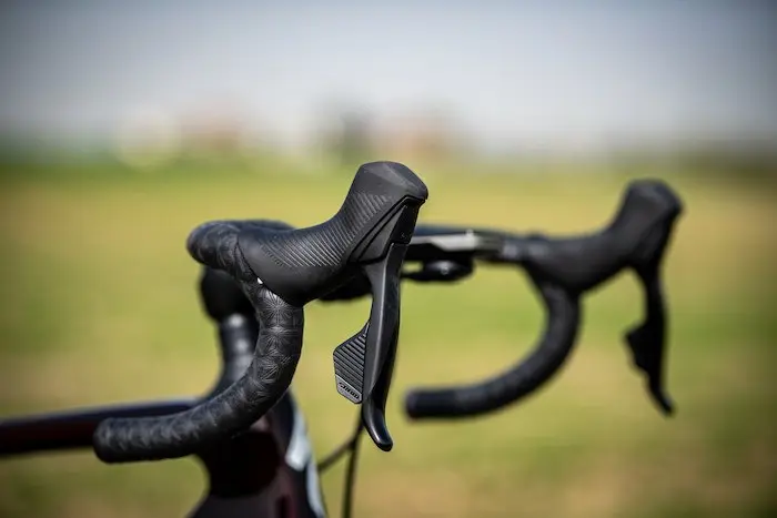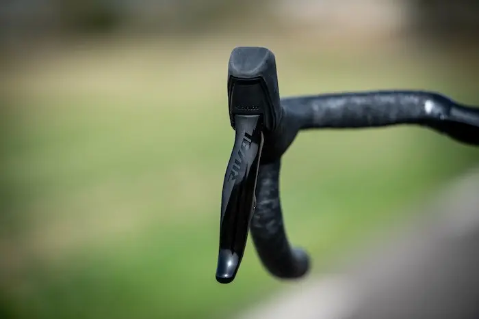 Au niveau des manettes, Sram a réalisé un gros effort pour diminuer légèrement leur taille par rapport aux Red et Force AXS, mais aussi pour améliorer leur ergonomie et leur finition. Une taille légèrement inférieure permise grâce à l’absence de ports pour les commandes de changements de vitesse supplémentaires (les « Blips » de Sram qui peuvent être utilisés avec les Force et Red). Mieux adaptées à des petites mains, les manettes Rival sont aussi beaucoup plus confortables, grâce au soin apporté à la partie cachée des leviers, là où les doigts viennent s’agripper en plein effort. Le contact est beaucoup plus doux qu’une manette Red, qu’on peut même parfois trouver coupante à cet endroit. Notons également la partie texturée des cocottes et des palettes de changements de vitesse, qui améliore la prise en main. Ces poignées sont une vraie réussite, et leur finition rehausse même le niveau de gamme du groupe.