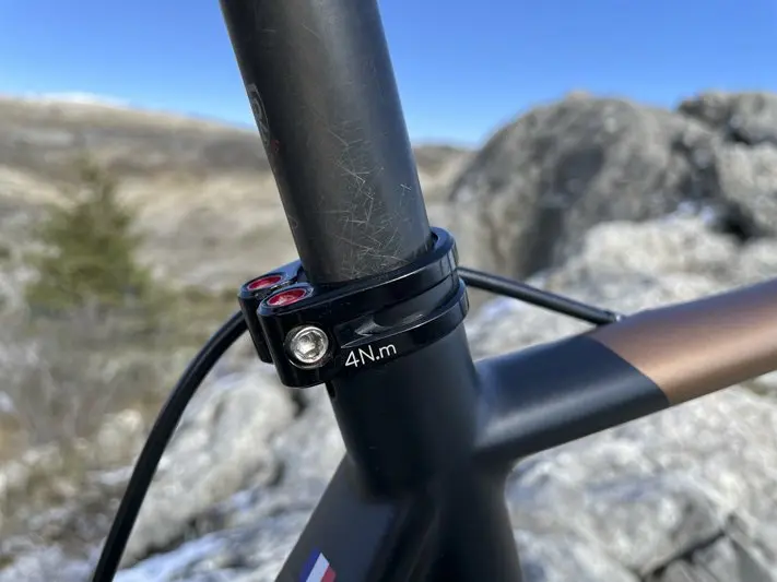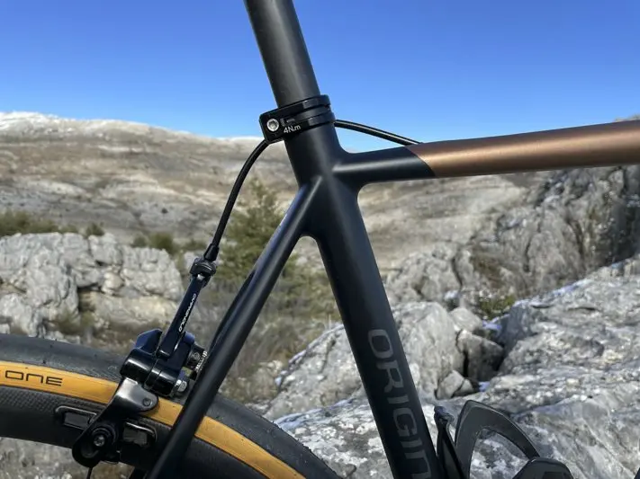 Avec ce montage, le configurateur indique 6,4 kg (sans pédales) et un tarif de 6 000 € (Kit cadre à 2 131 €). À noter également que les câbleries restent apparentes tout comme le serrage de selle toujours pas intégré (signe du souhait de la marque de conserver la facilité d’entretien pour l’utilisateur et de ne pas alourdir le nouveau cadre), une tige de selle ronde, une potence standard. Origine a une ligne directrice et elle s’y tient.