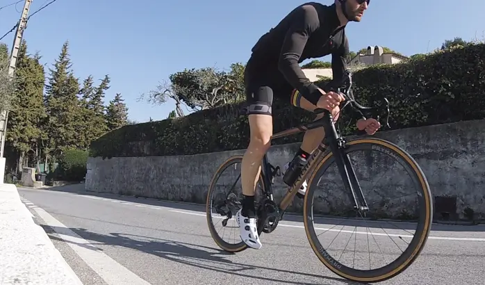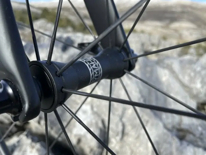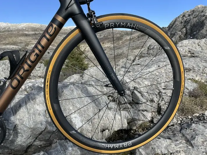 On remarque d’ailleurs que les rayons aéro ne sont pas tendus au maximum pour ne pas trop raidir les roues. Pour les gros rouleurs, les très expérimentés et vrais coursiers, l’ensemble manque clairement de rigidité pour exprimer totalement ses moyens et avoir le retour d’énergie attendu. Mais encore une fois, Origine ne cherche pas cet objectif de rigidité à tout prix, et livre ici des roues dans la même dynamique que le cadre, joueuses mais raisonnables, réactives mais accessibles et faciles à emmener dans toutes les situations, notamment lorsque les pourcentages se font plus raides et demandent plus de puissance, quand il faut appuyer toujours plus fort ou que l’enchaînement des kilomètres a engendré un excès de fatigue et qu’il faut rentrer à la maison. Les propriétaires d’un Origine s’y retrouveront donc parfaitement tout comme les futurs accédants qui ont pleinement conscience de leur capacités réelles et souhaitent un vélo qui tolère leurs faiblesses chroniques ou passagères.