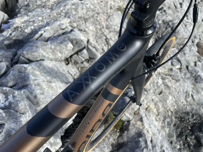Le précédent opus, l’Axxome II que nous avions testé dans sa version freins à disque, nous avait fortement enthousiasmé de par son cadre nerveux, joueur dans les pourcentages, mais aussi et surtout tolérant et très confortable sur longue distance. Aussi, nous attendions énormément de cette version Evo. Indéniablement, ces qualités sont toujours aussi présentes dès les premiers coups de pédale pourtant en bosse, sans aucune période d’observation entre l’homme et la machine.