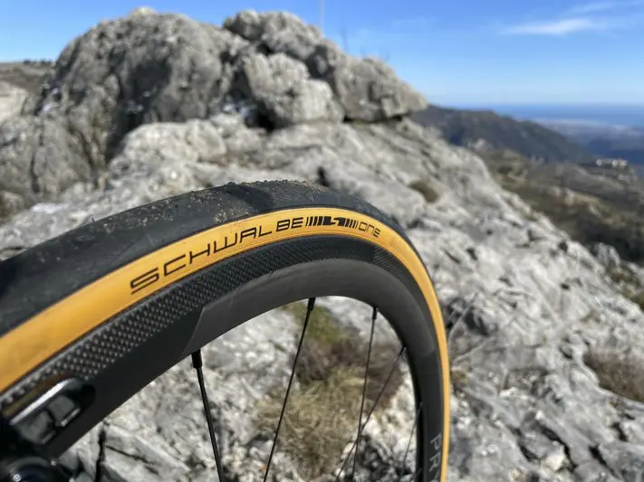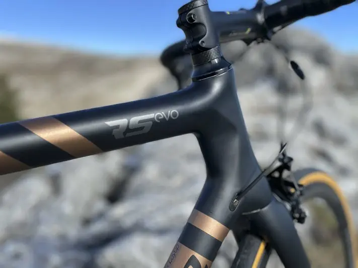 Notre cadre d’essai, le RS EVO pesé à 671 g nu, s’accompagne des roues carbone Prymahl Orion à jantes basses (C35) en freinage à patins et finition Pro (rayons aéro 20 av. radial et 24 ar. radial côté parapluie et croisement par 2 côté cassette, d’un poids de 1 390 g à 1 699 €) équipées des pneus Schwalbe Pro One en section de 25 mm. On retrouve également une transmission Campagnolo Super Record en compact (50-34) et 12 vitesses (11-32), des composant Ritchey (cintre, potence, tige de selle) et une selle Italia SLR Boost Superflow.