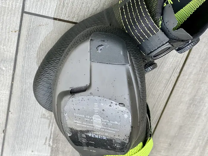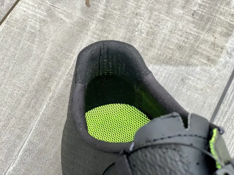 Pour l’empeigne, fi’zi:k a choisi ici une combinaison de polyuréthane laminé et de mesh, afin d’assurer un bon maintien de la tige et une bonne respirabilité tout en évitant les superpositions gênantes et les plis au moment du serrage. Le talon remonte assez haut et se montre enveloppant, sans être trop rigide au premier abord. Des petits inserts en silicone évitent au pied de glisser pendant l’effort et assurent un bon maintien.