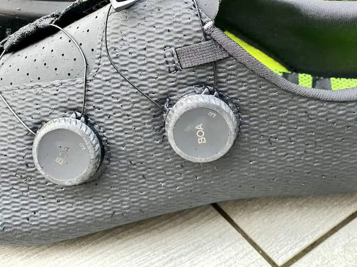 La partie supérieure du serrage avec la sangle qui part de la semelle apporte d’emblée un serrage ferme et assez rigide. Le pied est parfaitement maintenu et semble faire lien directement avec la pédale et surtout de manière très stable. C’est particulièrement sensible lors des ascensions en danseuse ou en sprintant. Reste que la partie supérieure de l’empeigne, au dessus de la languette et sur le cou-de-pied se montre particulièrement rigide, ce qui peut être plus ou moins confortable selon le type de pratique. Les cyclistes les plus engagés dans l’effort apprécieront en tout cas cette sensation de fermeté sur le dessus du pied. Notons toutefois que ce contact viril avec l’empeigne ne procure pas spécialement de douleurs au fil des kilomètres, et que les couches de matières se superposent sans plis ce qui permet d’éviter les sensations de coupure de la circulation sanguine et les fourmillements associés.