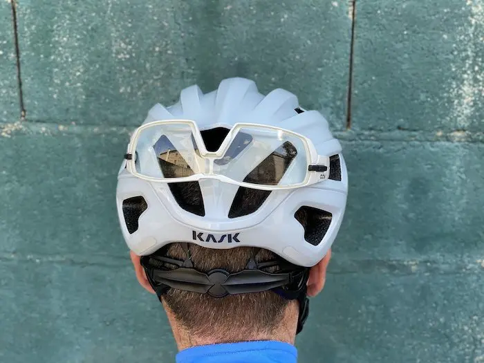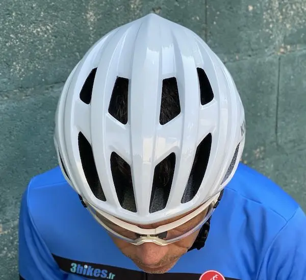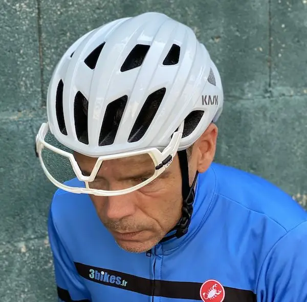 Le seul bémol est à mettre au débit des entrées d’air, non prévues pour le placement des branches de lunettes, au cas où l’on voudrait les placer sur le casque (si elles gênent sous la pluie ou dans une grosse ascension de col par exemple), alors que c’est une opération beaucoup plus simple à réaliser avec le Protone. Évidemment, on peut toujours les placer sur le casque, mais même avec des lunettes de la marque soeur Koo, l’orientation des évents empêche un bon maintien, et on risque de les perdre au moindre soubresaut du bitume. Il reste possible de placer les lunettes sur l’arrière du casque, mais c’est très peu pratique à réaliser en roulant.