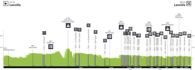 Lannilis, départ fictif (11 h 25), Plouguin, départ réel (11 h 40), Ploudalmézeau (11 h 48), Argenton (12 h 03), Lanildut (12 h 12), Bréles (12 h 18), Lanrivoaré (12 h 26), Milizac (12 h 35), Bourg-Blanc (12 h 45), Plabennec (12 h 54), Saint-Divy (13 h 06), Landerneau (13 h 13), Pencran (13 h 22), Plouédern (13 h 34), Ploudaniel (13 h 53), Trégarantec (13 h 58), Lesneven (14 h 04), Plouider (14 h 10), Goulven (14 h 13), Guissény (14 h 34), Plouguerneau (15 h 06), Lannilis, 1er passage sur la ligne d’arrivée (15 h 27), 2e passage sur la ligne (16 h 16), arrivée (16 h 36).