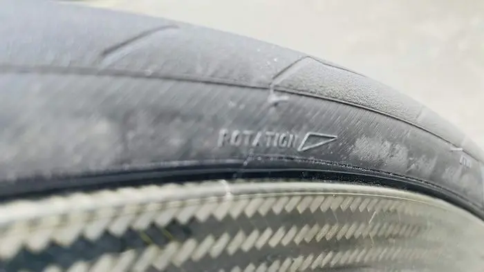 Les P Zero Race sont particulièrement faciles à monter (ici sur des Fulcrulm Racing Speed), et ne nécessitent pas l’emploi de démonte-pneus. Il faut prendre soin néanmoins de respecter le sens de rotation préconisé, indiqué par une flèche sur le flanc, et sans doute prévu pour suivre le sens des marquages situés sur la chape, destinés à favoriser l’évacuation de l’eau sur route humide.