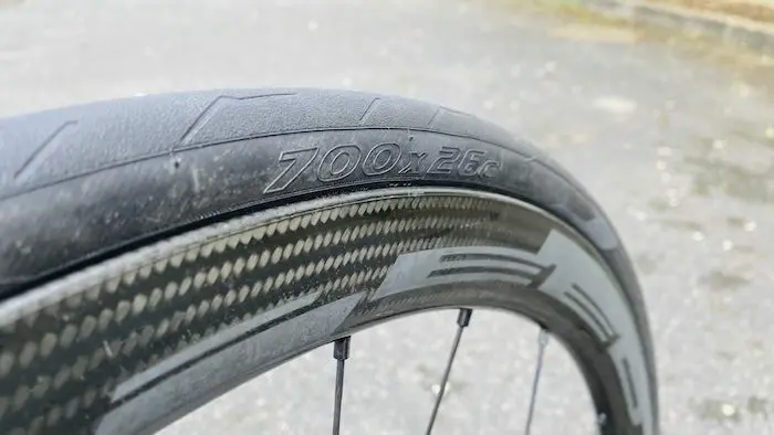 On retrouve ainsi une carcasse Nylon 127 TPI avec des tringles souples en aramide, et une couche de tissu nommée TechBELT Road pour la protection contre les crevaisons (à la place de la couche aramide). La nouveauté se situe plutôt au niveau de la chape, avec l’utilisation d’un mélange de polymères nommé SmartEVO Compound, destiné à diminuer la résistance au roulement et améliorer l’adhérence, même sur sol mouillé. Le P Zero Race est disponible en section de 700×26 (choisie pour ce test), 700×28 et 700×30, avec des flancs noirs ou marrons foncés (Classic). Sur une jante de 19 mm de largeur intérieure, les 700×26 sont mesurés à 27,5 mm de section réelle, et ils présentent une forme légèrement ovale vue de haut. Le poids vérifié pour les deux exemplaires de test est de 210 et 214 g, ce qui est particulièrement performant pour cette section par rapport à la concurrence. Enfin, notons un prix de vente relativement élevé de 59,90 € l’unité, ce qui n’est pas donné dans l’absolu.
