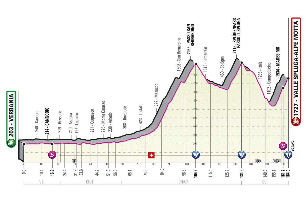 Le deuxième col (Splügen Pass) sera plus court mais dépasse également les 2000 m. Une descente annoncée technique amènera les coureurs à Campodolcino, véritable pied de la montée finale vers Alpe Motta. L’enchainement se fera sans transition, ce qui pourrait amener à une course de mouvement dès l’avant dernier col.