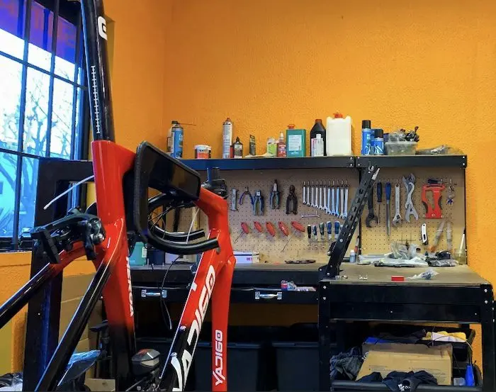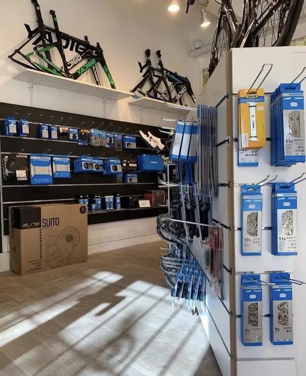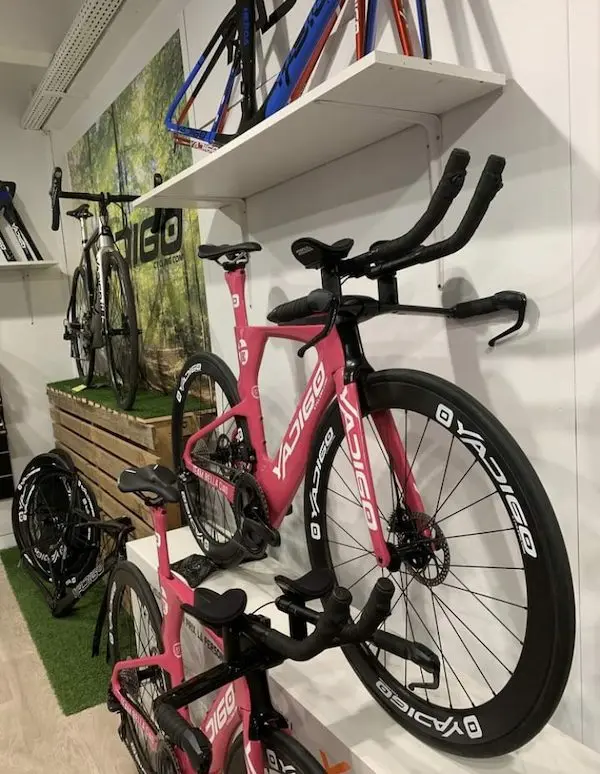 Les montages sont faits à la carte. Il a développé ses propres cadres. Une géométrie bien singulière. Une déco et des couleurs inspirées de chez Specialized. Antoine propose des produits d’excellence à ses clients. Pour des prix plus qu’attractifs. Pour 4000 €, vous pouvez repartir avec un modèle qui est exposé sur un support au milieu de la boutique. Équipé en 1X13 Groupset kit 2Inpower de chez Rotor avec une paire de roues carbone haut de gamme en 50 mm. Spécialisé dans le domaine de la route et de la piste, Antoine développe également du VTT et évidement le segment Gravel, dont il mesure tous les avantages. Antoine explique aussi qu’il compte développer des animations autour de cette nouvelle pratique qui fait tant d’émules depuis quelques temps.