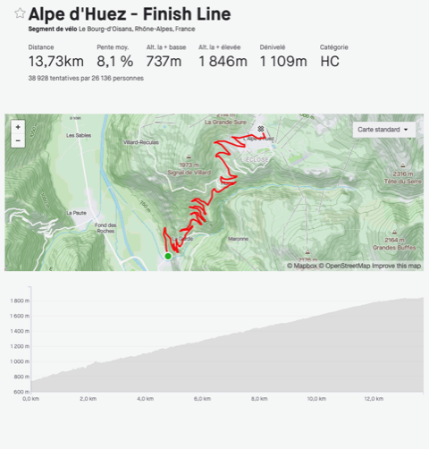 – Un petit répit à Villard Reculas avant une transition avec le pas de la Confession, une petite descente (1500 m) avant de reprendre la route de l’Alpe classique à Huez jusqu’à l’avenue du Rif Nel à 1850 m.